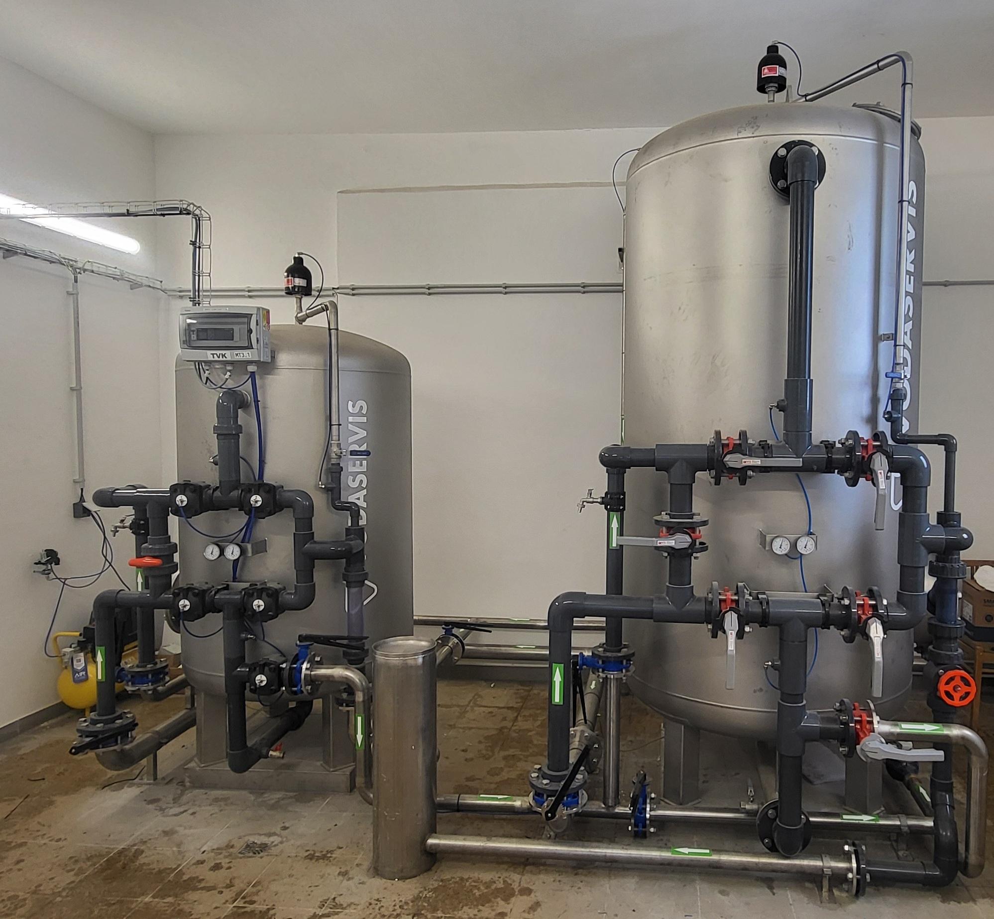 Výroba a dodání technologie úpravy vody pro max. průtok 0,7 l/s pro odstranění pesticidních látek a dusičnanů ze zdroje pitné vody - nerezový manuální filtr TVK 70 UMT 1,5 a dusičnanový filtr TVKP 30 DH, O, 60, vč. vystrojení úpravny v PVC.