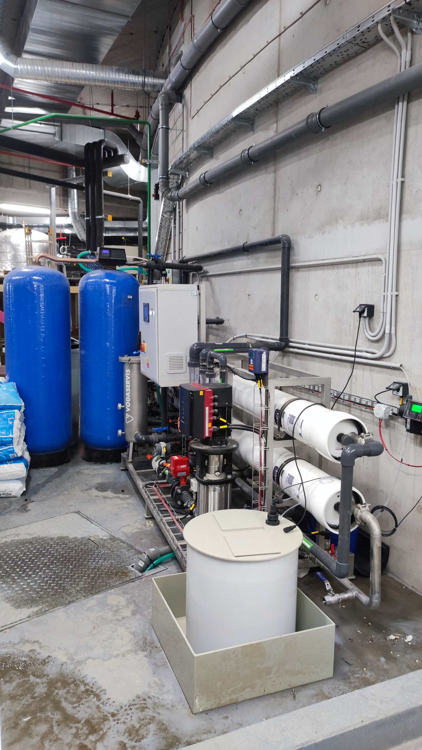 Production and delivery of new water treatment technology with a maximum output of 4.4 l/s for 1. ice production (reverse osmosis unit, stainless steel sleeve filter RF 20, stainless steel candle filter SF 6/20, automatic duplex softening filter, UV lamp), 2. for filtration of recirculated water from the snow pit (mechanical stainless steel sleeve filter RF 10 and automatic stainless steel pressure sand filter TVK 80) and 3. for air conditioning cooling condensers (automatic duplex softening filter), incl. chemical management, pipe connections and technical electrical installations.